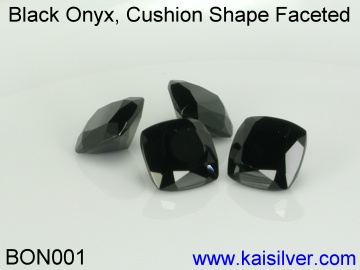 The above image shows some fine cushion shaped faceted black onyx gemstones. Custom onyx cufflinks can be made with onyx gems that have the shape and cut of your choice. When you have faceted gems in your cufflinks keep in mind that, the edges where the facets meet can show wear and tear markes. We would therefore recommend that flat or a slight curved cut be used on the gems for your cufflinks. The multi faceted checkerboard cut, looks awesome but, the more the facets and planes, the more carefully you will need to be when wearing or storing your black onyx cufflinks.