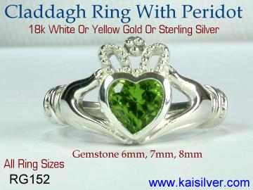 Kaisilver claddagh rings are custom made in gold or sterling silver. You can choose 14k or 18k claddagh rings and select the option for a yellow or white gold claddagh ring too. The RG152 is shown in sterling silver with a peridot gemstone. Get full details on this amazing jewel at Peridot Claddagh Ring.