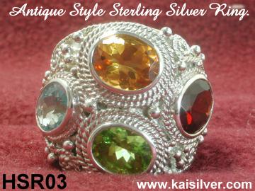 The HSR03 is an awesome antique style silver ring from Kaisilver. You can order this silver gem stone ring with gem stones of your choice. The ring includes handpicked gems that are custom cut by our skilled gem cutters. ... more.