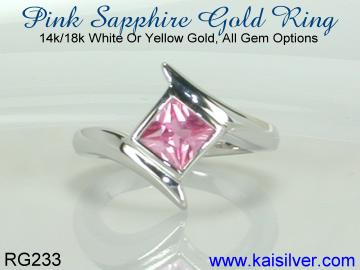 A spectacular pink sapphire white gold ring, perfectly suited for a sapphire wedding or engagement ring. A single gem stone ring that stands apart. Sleek design and yet a very durable jewel, one gain custom made with all gem options. ... more.